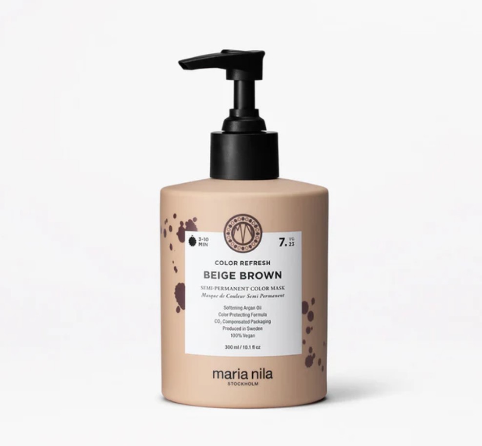 Maria Nila Color Refresh 7.23 Beige Brown er en nærende hårkur med semi-permanente fargepigmenter som raskt frisker opp hårfargen og gir beige-brune toner. Produktet er en hårkur som tilfører farge og pleie samtidig. Arganolje tilfører fuktighet og reduserer frizz for et silkemykt og glansfullt resultat. Passer for de som ønsker å friske opp hårfargen eller endre nyansen midlertidig.